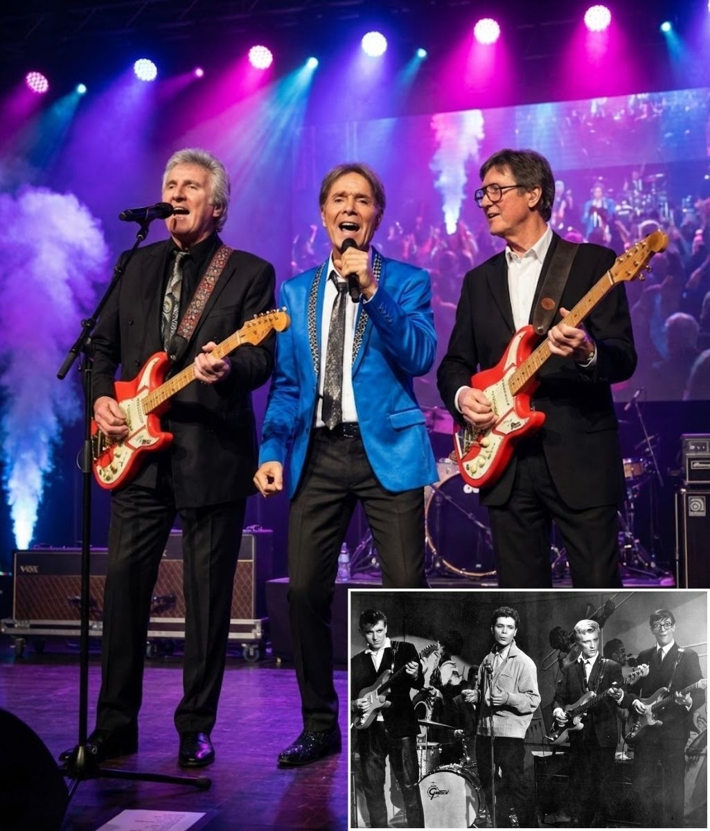 Hank Marvin’s guitar tone—so unmistakable, so precise—cut through the air with quiet authority. It was not loud, not aggressive. It did not need to be. It carried the weight of history, shaped by decades of discipline and devotion. Bruce Welch stood beside him, steady and grounded, the kind of presence that does not demand attention but earns it through constancy. And when Cliff Richard stepped forward, his voice rose not as a relic of the past, but as a living, breathing reminder of why it all mattered in the first place.